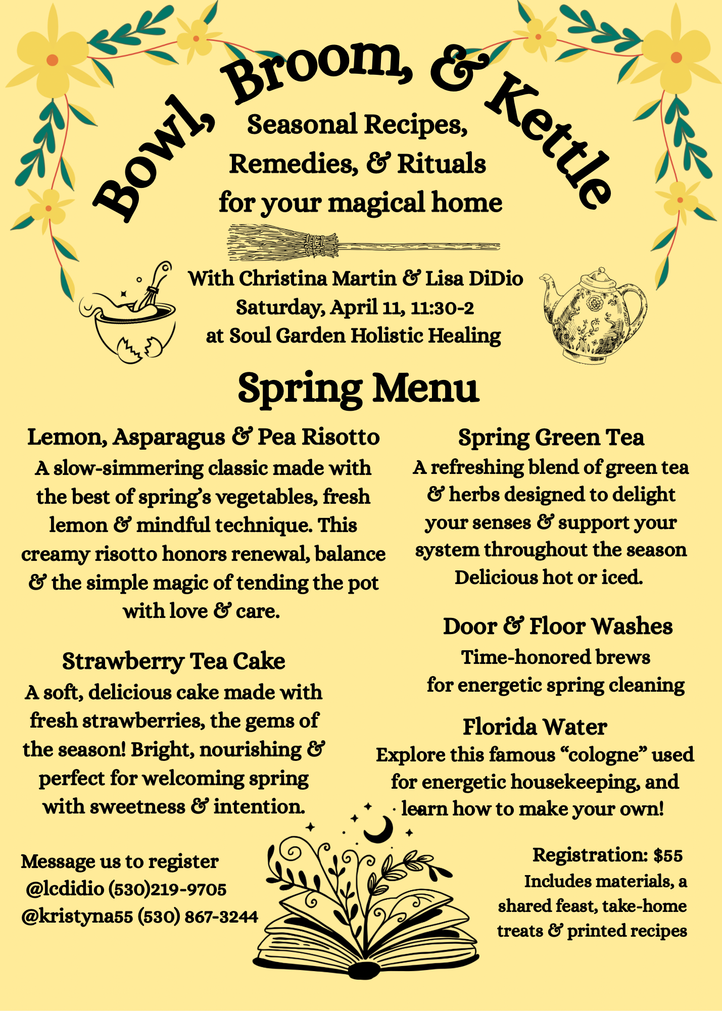 Join Christina & Lisa for the spring edition of this class. You will prepare and share a feast full of the season’s finest offering, sip tea an explore methods of magical housekeeping to incorporate into your spring cleaning.
