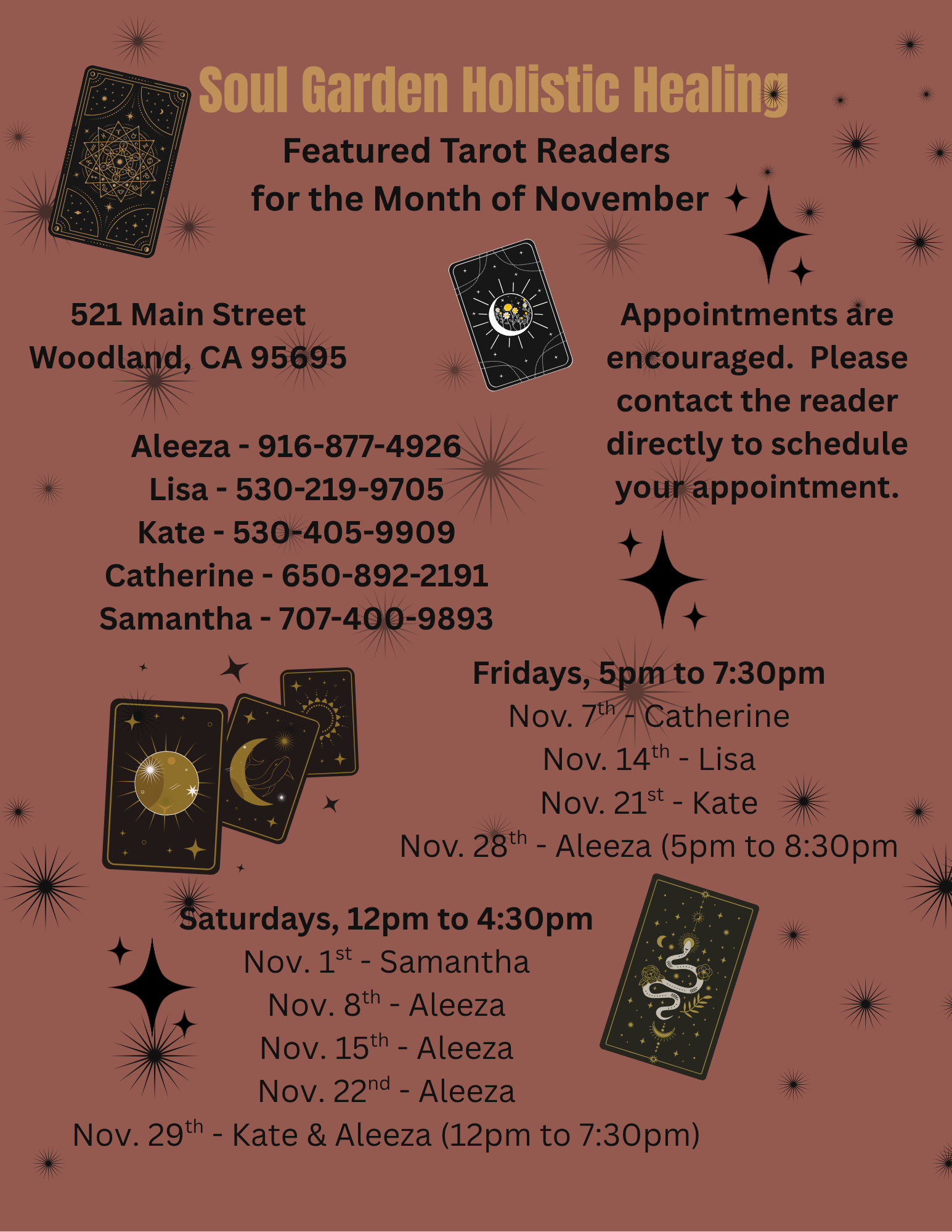 Welcome to Soul Garden Holistic Healing, your sanctuary for wellness in downtown Woodland, California. We are proud to host a rotating group of gifted tarot card readers, astrologer, mediums & psychics—each offering their unique services in our tranquil space.